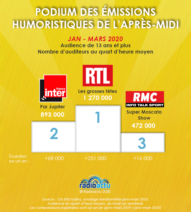 Audiences radios janvier – mars 2020 : podium des émissions humoristiques d’après-midi