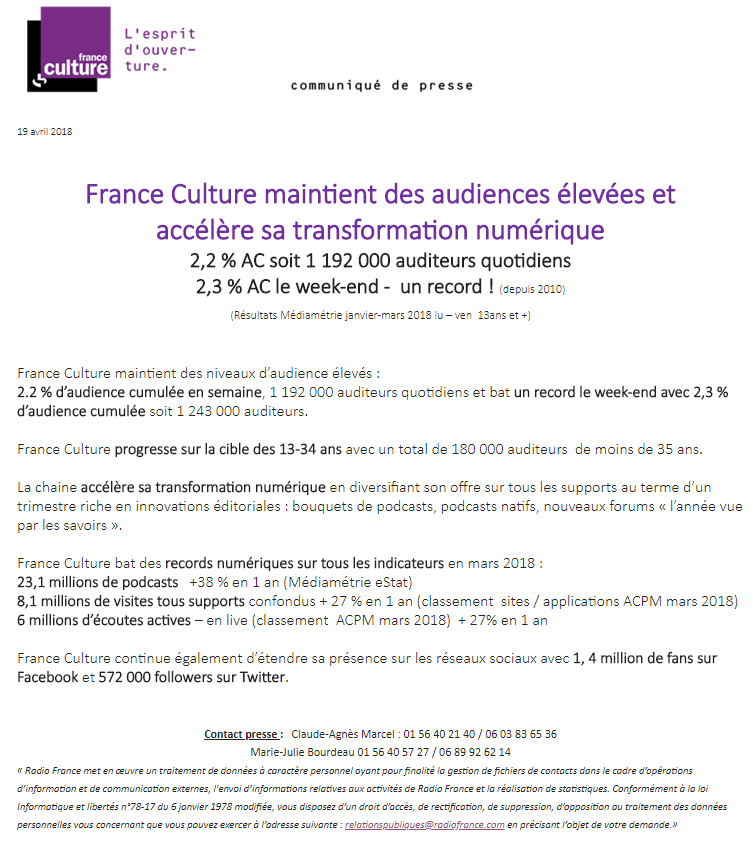Communiqué : France Culture maintient des audiences élevées