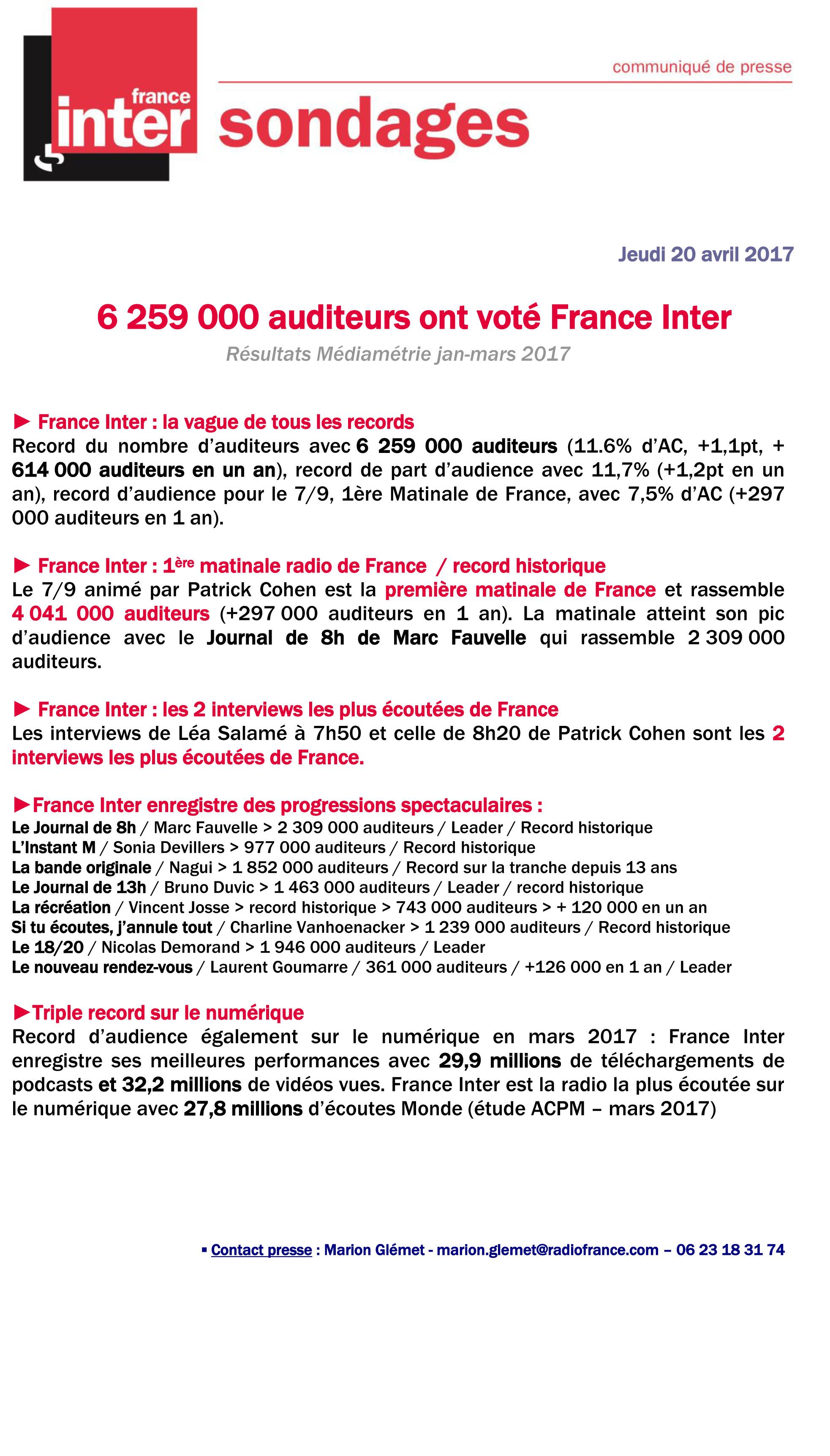 Communiqué France Inter audience janvier mars mediamétrie