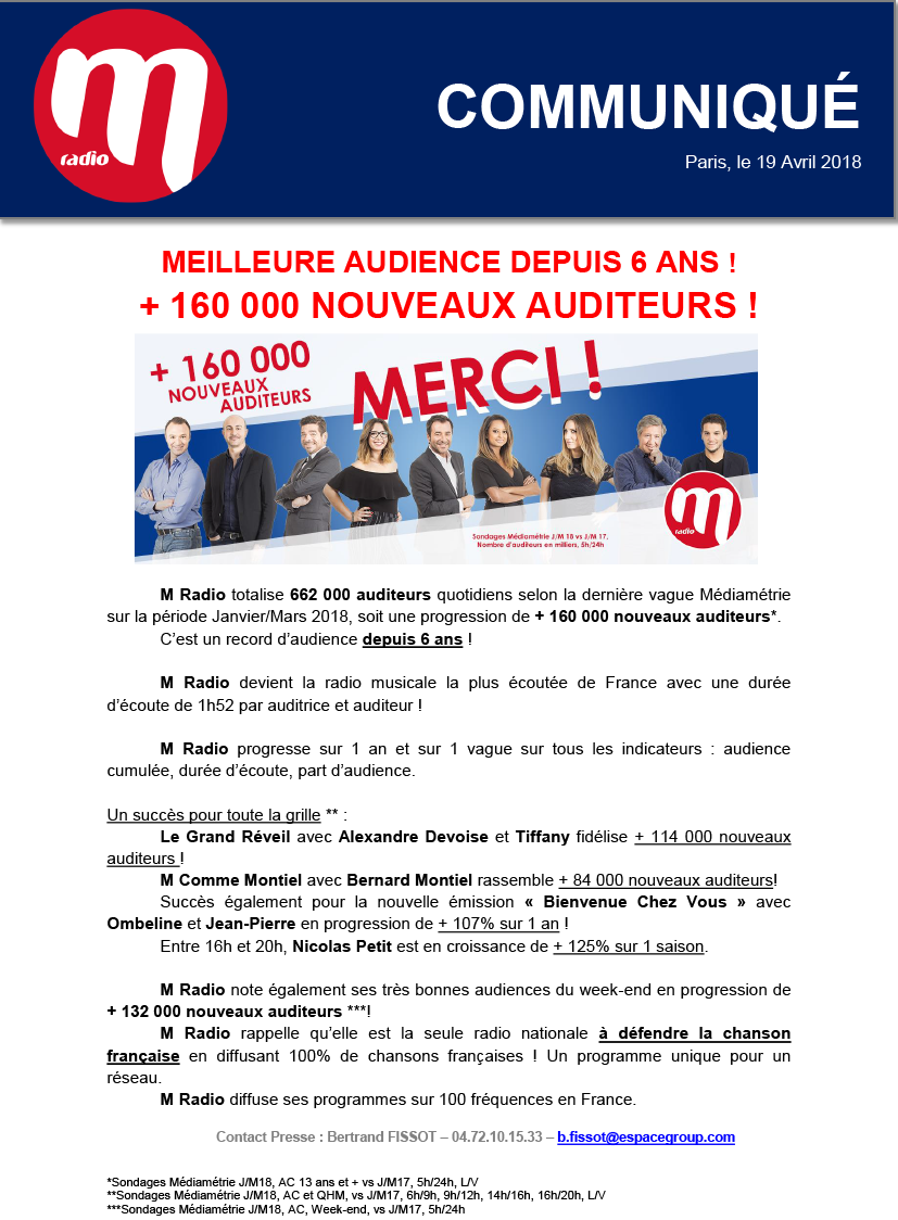 Communiqué : M radio, meilleure audience depuis 6 ans !