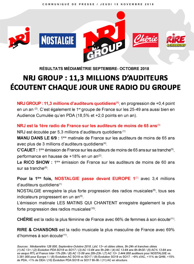 Communiqué : NRJ Group, 11,3 millions d’auditeurs chaque jour