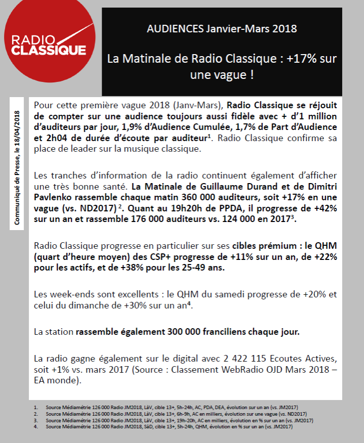 Communiqué : Radio Classique, la matinale gagne 17% sur une vague