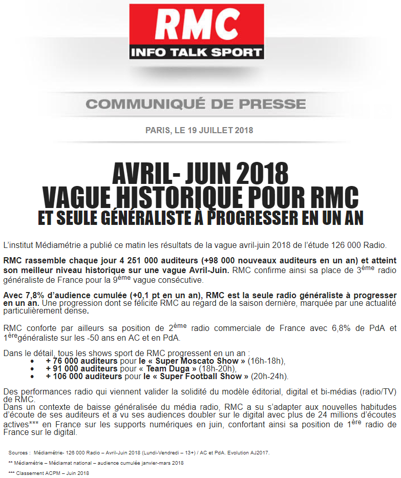 Communiqué : RMC, vague historique et seule généraliste à progresser en un an