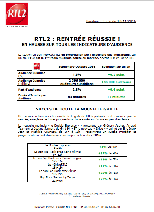 Communiqué : RTL2, une rentrée réussie